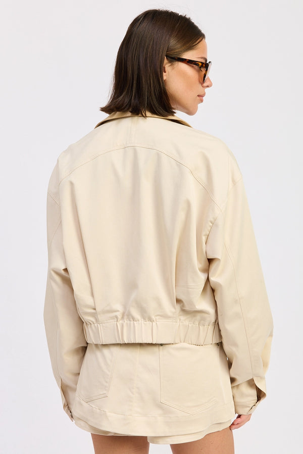 Keep it sleek and minimal with this beige zip-up utility jacket — the perfect balance of structure and ease. Designed with a modern cropped silhouette, it features a full front zipper, adjustable waistband, and functional front pockets. The contrasting tan...